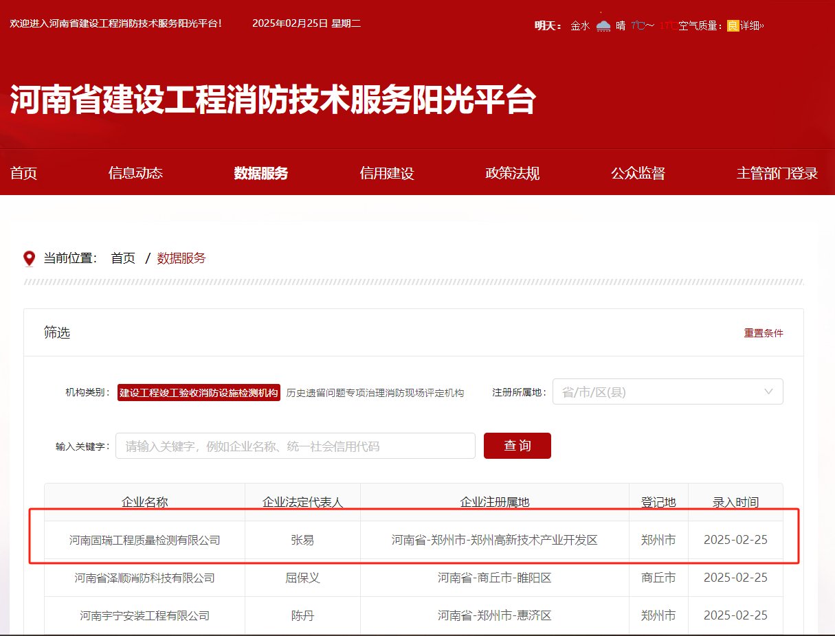熱烈祝賀河南固瑞工程質量檢測有限公司入冊河南省建設工程消防技術服務陽光平臺!!!